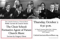The Choir School: Formative Agent of Future Church Music Lecture by Gregory Glenn Date: Thursday, October 2nd Time: 6:30 p.m. to 7:30 p.m. Pacific, followed by a reception Location: St. Patrick's Seminary (Menlo Park, California) and Online via Livestream Tickets: Free, or suggested donation of $20
