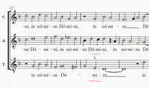 For example, Kyrie II is almost directly copied from the jacentem in praesepio segment of the motet, however the Alto has B-flat on measure 23 of the Kyrie (see 'A' attachment below) instead of B-natural as on measure 32 of the motet ('B' attachment).